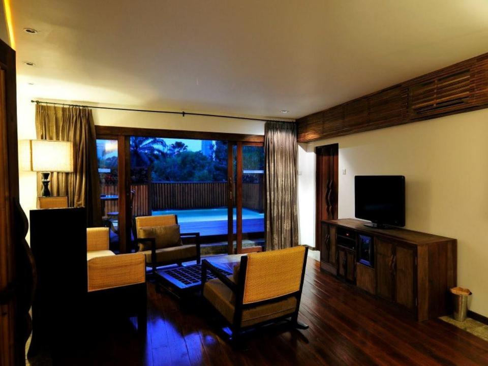 This room screams luxury from its rainfall shower to its secluded outdoor swimming pool. The air-conditioned unit comes with free toiletries, a refrigerator, an electric kettle and a safety deposit box. There’s a living room with chairs and a couch as well as a television.