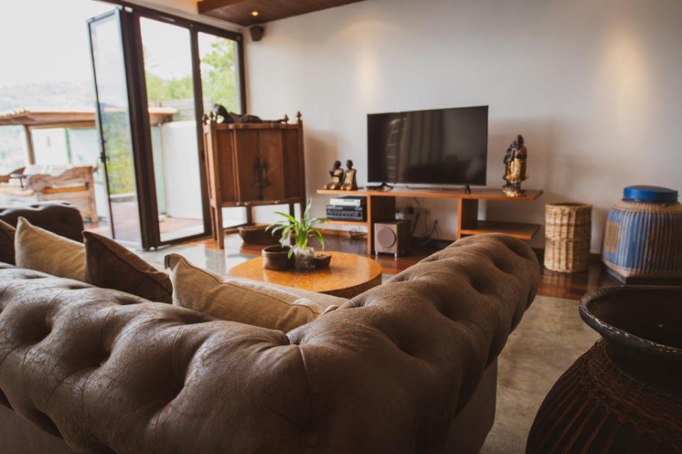 The villa is fully furnished with a dining area and well-equipped kitchen. It boasts a stove-top oven, fridge and microwave. There’s a lounge area as well which has a TV.